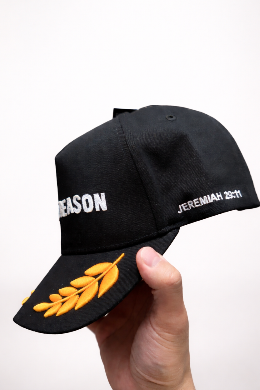 White Patched "Good Reason" on the front & JEREMIAH 29:11 on the side of the hat with the verse under the brim.